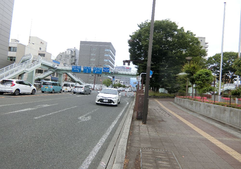 この先の大きな交差点は右に行くと「甲府駅」と案内している。横断歩道橋の上から通りを見た。なかなかきれいだ。