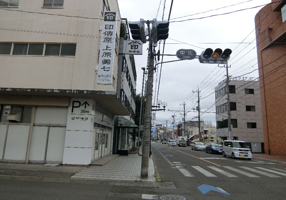 甲府市中心部に近いのに道路にはちゃんとした歩道もない。交差点は「中央」とあるが・・・。