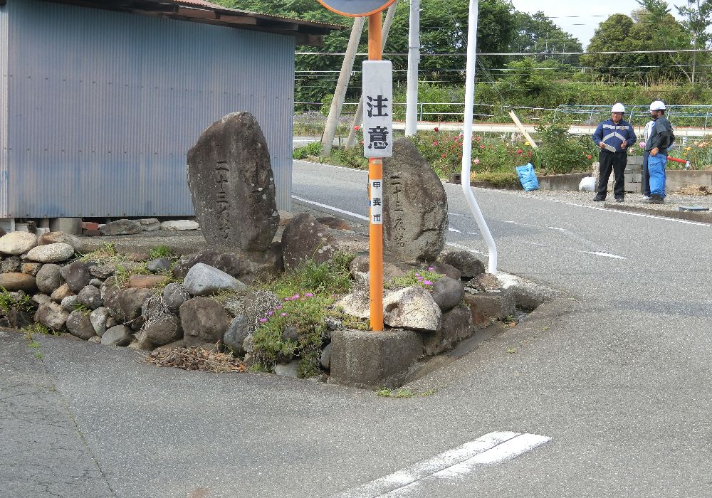その先の「川田の道標」は標柱が半分埋まってしまっている。なぜ? 「左甲運橋 右富士山大山東京道」