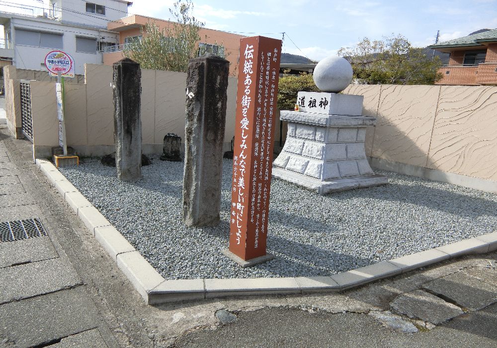 丸い石の玉が載っている道祖神、新しい。この丸い球はあちこちにあるようだ。笛吹権三郎の像のところにもあった。