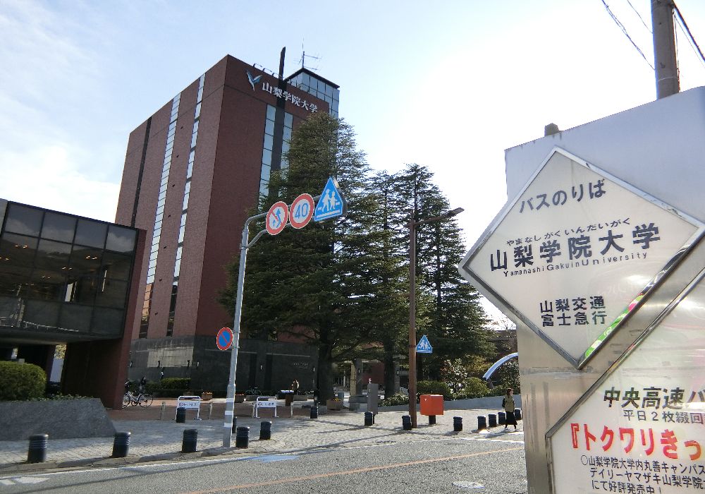 日が西に傾きはじめまぶしい中、「酒折駅入り口」を過ぎ「酒折宮」を過ぎると左手に山梨学院大学の校舎。